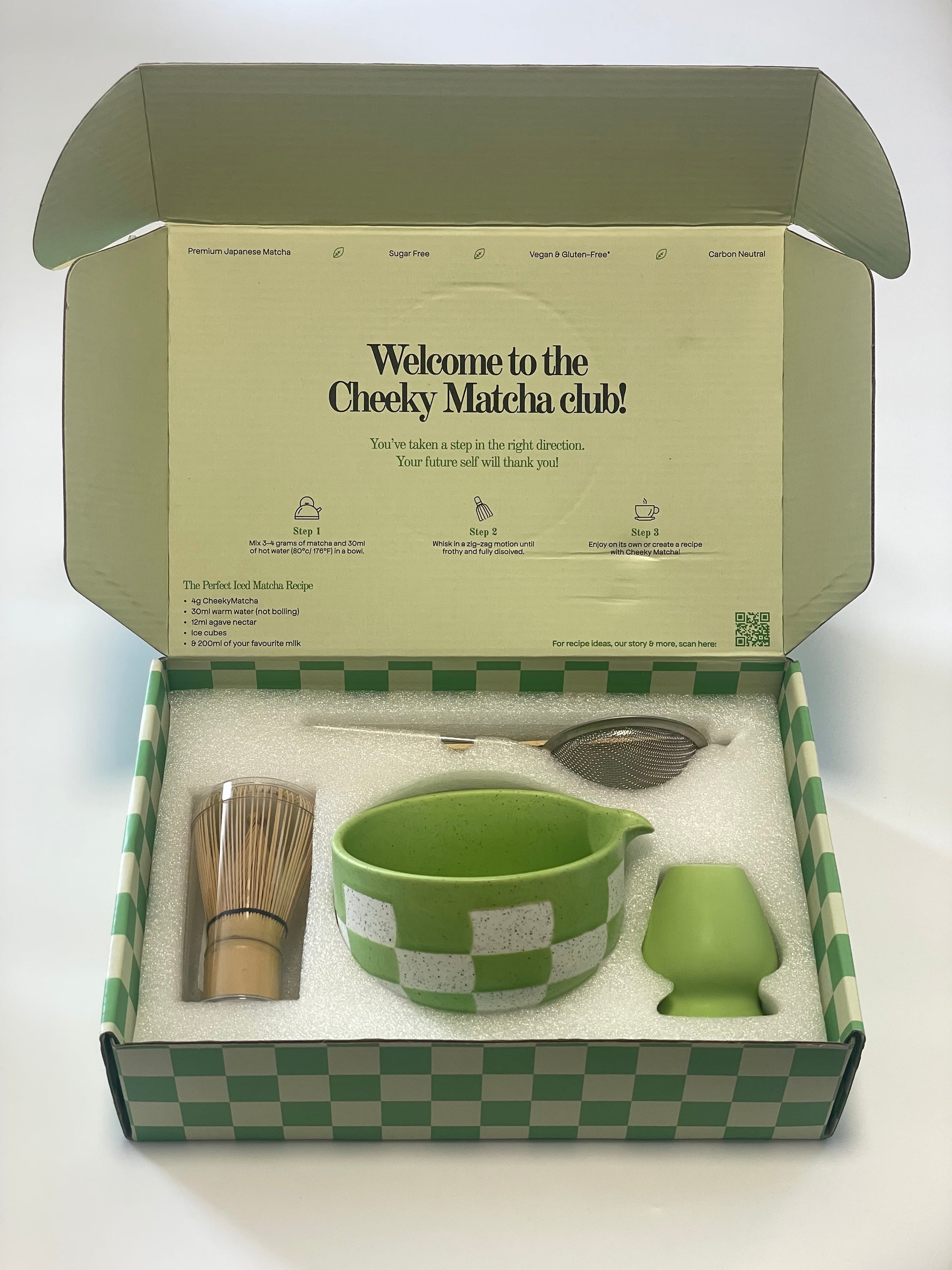 Say hello to your new ritual. This curated box includes our signature bamboo whisk to get that silky froth just right, and the Cheeky checkered matcha bowl, a whisk holder, a sieve and a matcha spoon — cute, and ready for hot girl gifts.